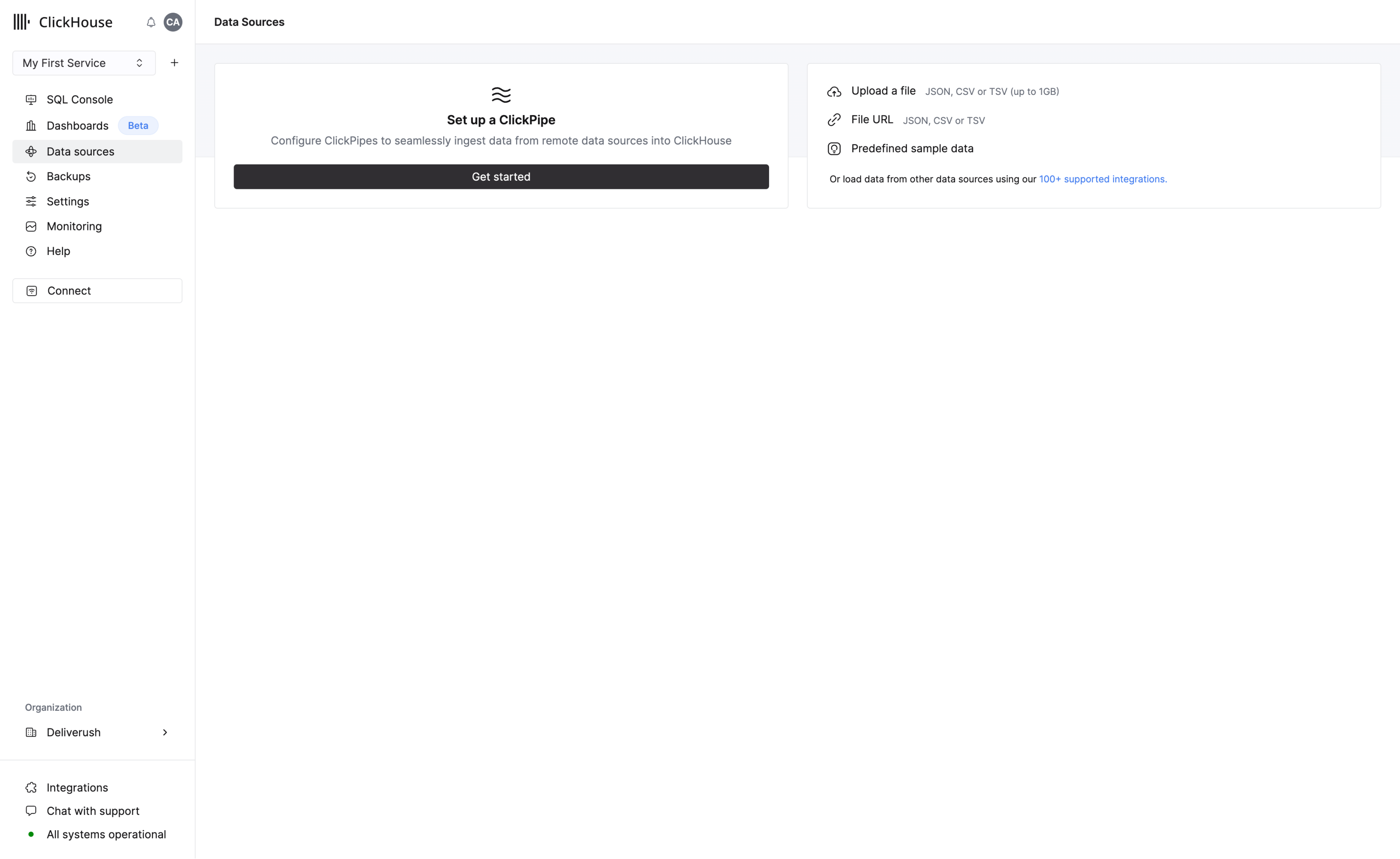 ClickHouse is better with data! There are multiple ways to add data and most of them are available on the Data Sources page, which can be accessed in the navigation menu.